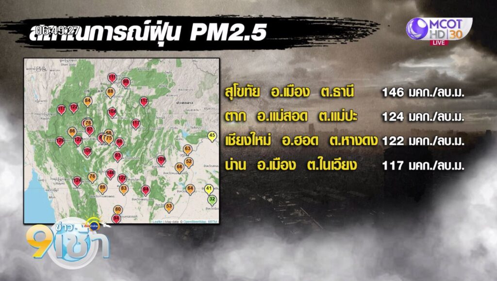 ส่วนค่า PM 2.5 ในไทยจากรายงานของ AIR4THAI เมื่อเวลา 04.45 น. ที่ผ่านมา จะเห็นว่าตอนบนของไทย โดยเฉพาะภาคเหนือค่าฝุ่น ถือว่าน่าห่วงมาก เกินมาตรฐาน ในระดับสีแดง หลายพื้นที่ จุดที่ค่าฝุ่นสูงทะลุหลักร้อยมีหลายจุด เช่น ต.ธานี อ.เมือง จ.สุโขทัย ค่า PM 2.5 อยู่ที่ 146 มคก. /ลบ.ม. ต.แม่ปะ อ.แม่สอด จ.ตาก อยู่ที่ 124 มคก. /ลบ.ม. ต.หางดง อ.ฮอด จ.เชียงใหม่ 122 มคก. /ลบ.ม. และ ต.ในเวียง อ.เมือง จ.น่าน ค่าฝุ่น 117 มคก. /ลบ.ม. -สำนักข่าวไทย