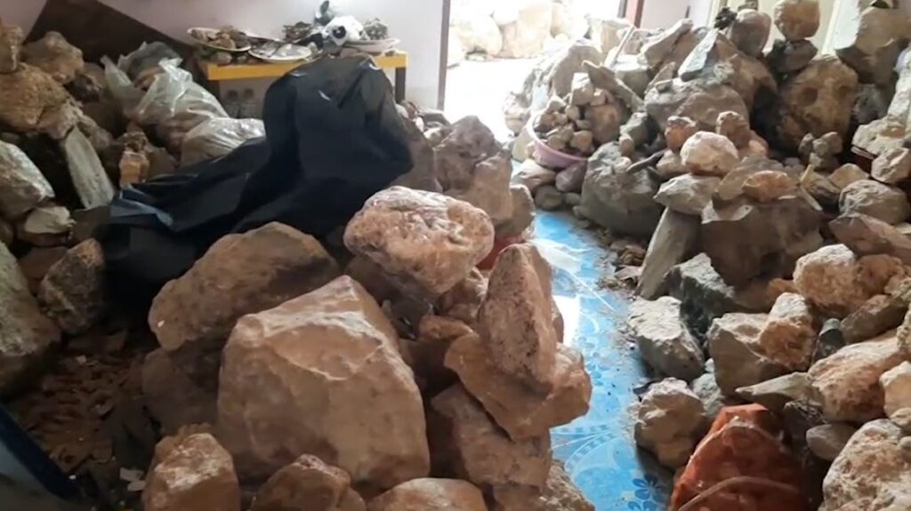 นี่คือสภาพห้องเช่าที่มองไปมุมไหนก็เต็มไปด้วยก้อนหินขนาดเล็กใหญ่กองเรียงรายจนแทบไม่มีที่เดิน แม้กระทั่งที่นอน ห้องน้ำ ตู้เสื้อผ้า เต็มไปด้วยหิน หนักหนาสาหัสจนกองก้อนหินทะลักออกไปนอกห้อง ตำรวจที่มาบ่นเป็นเสียงเดียวกันว่าจะทำไปทำไม
