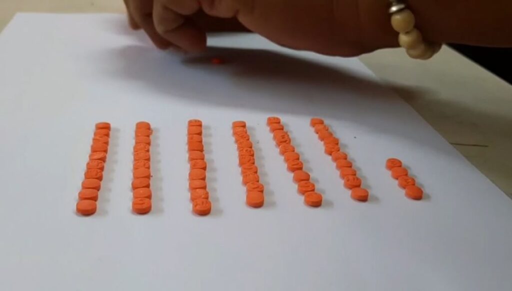 เมื่อตรวจสอบพบก้อนหินจำนวนมากวางอยู่บริเวณพื้นห้องนอนและห้องน้ำเต็มจนล้น ทั้งในตู้เสื้อผ้าและหัวนอน ยังเต็มไปด้วยก้อนหิน นอกจากนี้บนหลังตู้ยังพบหินทรงแบนตั้งแทนพระบูชาอีกด้วย เจ้าหน้าที่ชุดจับกุมต้องตรวจค้นห้องพักที่เต็มไปด้วยกองหินอย่างทุลักทุเล เพื่อค้นหายาเสพติดเพิ่มเติม กระทั่งพบยาบ้าบรรจุอยู่ในถุงพลาสติกสีฟ้าซุกซ่อนอยู่ในซอกหินจำนวน 64 เม็ด รวมยาบ้าทั้งหมด 94 เม็ด จึงนำตัวมาสอบสวน