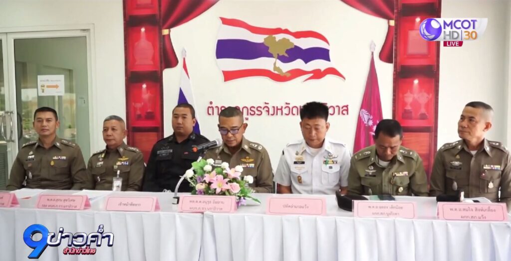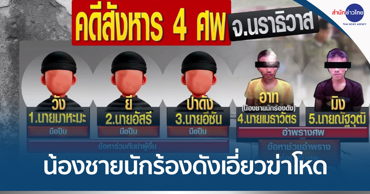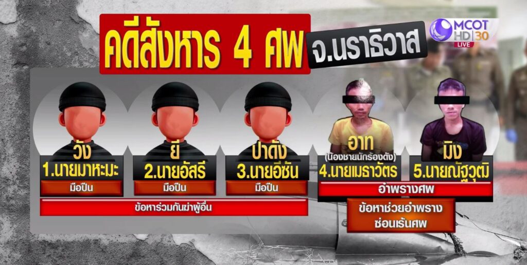 วันนี้ ตำรวจนราธิวาสและคณะ แถลงข่าวการจับกุมผู้ต้องหา จำนวน 5 คน ประกอบด้วย 1.นายมาหะมะ 2.นายอัสรี 3.นายอีชัน 4.นายเมธาวัตร ซึ่งเป็นน้องชายของนายเมธี นักร้องดังวงลาบานูน และ 5.นายณัฐวุฒิ ในคดีร่วมกันใช้อาวุธปืนยิงทำให้มีผู้เสียชีวิต จำนวน 4 คน เหตุเกิดคาบเกี่ยวในวันที่ 21 และ 22 ก.พ.66