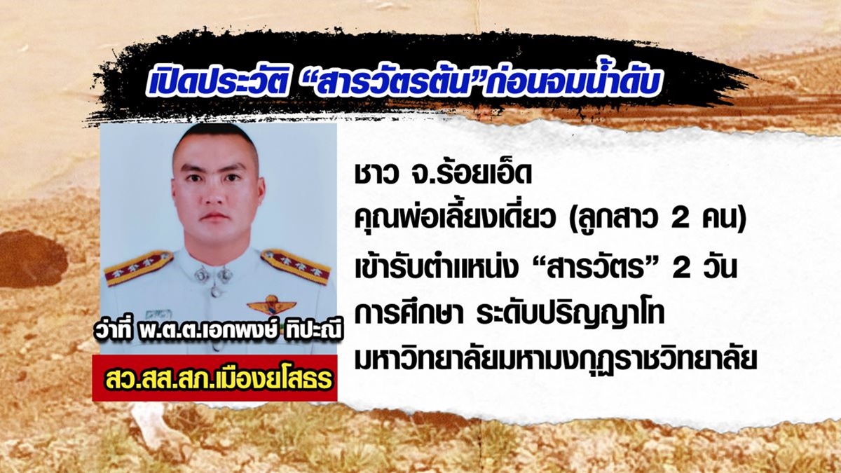 สำหรับประวัติของว่าที่ พ.ต.ต.เอกพงษ์ ทิปะณี หรือ สารวัตรต้น เพิ่งได้รับคำสั่งแต่งตั้งให้ดำรงตำแหน่ง พันตำรวจตรี เมื่อ 2-3 วันที่ผ่านมา โดย สารวัตรต้น เป็นคนจังหวัดร้อยเอ็ด จบปริญญาโท สาขาวิชารัฐศาสตร์การปกครอง มหาวิทยาลัยมหามกุฎราชวิทยาลัย วิทยาเขตร้อยเอ็ด เป็นคุณพ่อเลี้ยงเดี่ยว มีลูกสาว 2 คน. – สำนักข่าวไทย