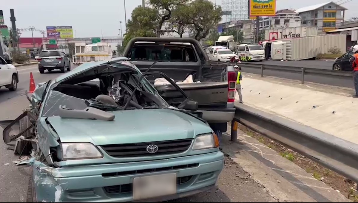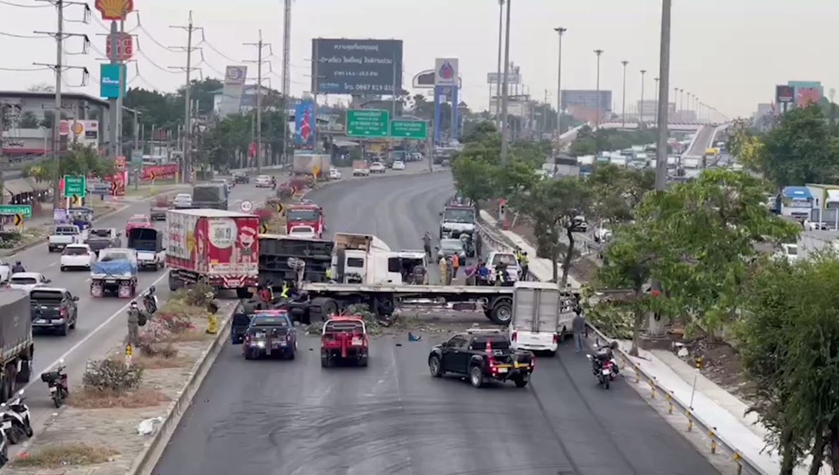 นนทบุรี 16 มี.ค. – เกิดอุบัติเหตุรถบรรทุกพ่วงชนท้ายรถเก๋ง ก่อนพุ่งข้ามเกาะกลาง ชนระเนระนาด 6 คันรวด มีผู้เสียชีวิต 1 ราย บาดเจ็บ 7 ราย