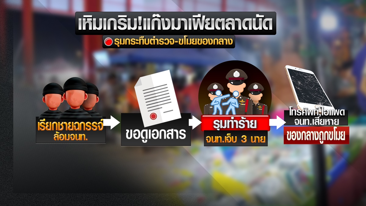 ขณะกำลังตรวจยึด มีชายใส่เสื้อกล้ามอ้างว่าเป็นผู้ดูแลตลาด เข้ามาพูดคุยพยายามเจรจาต่อรอง แต่ทางเจ้าหน้าที่ยืนยันจะจับกุมเฉพาะสินค้าที่ละเมิดเครื่องหมายการค้า ทำให้ชายคนดังกล่าว ซึ่งมีอาการคล้ายเมาสุรา เรียกชายฉกรรจ์หลายสิบคนมาปิดล้อมและพูดจาด่าทอ ก่อนจะขอดูเอกสาร ซึ่งทางเจ้าหน้าที่ก็แสดงหนังสือคำสั่งของตำรวจให้ดู แต่ชายคนดังกล่าวยังไม่พอใจ พอเห็นมีมวลชนเข้ามาจำนวนมาก เจ้าหน้าที่จึงพยายามจะถอยออกมา ก็ถูกรุมทำร้ายทันที จนต้องหนีเอาตัวรอด