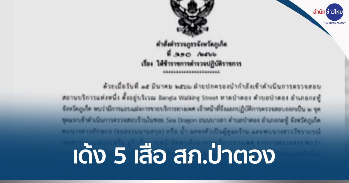 ภูเก็ต 17 มี.ค. – ผบก.ภ.จว.ภูเก็ต ลงนามคำสั่งให้ 5 เสือ สภ.ป่าตอง เซ่นฝ่ายปกครองบุกตรวจสถานบริการถนนบางลา-ป่าตอง พบเปิดบริการโดยไม่ได้รับอนุญาต และนำเด็กอายุต่ำกว่า 18 ปี มาขายบริการทางเพศ