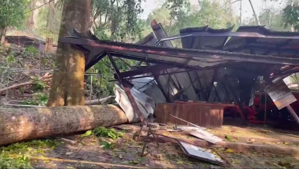 พายุฤดูร้อนพัดกระโชกอย่างรุนแรงในพื้นที่ อ.ศรีสวัสดิ์ จ.กาญจนบุรี ในช่วงเวลา 18.00-19.00 น.วานนี้ (20 มี.ค.) ทำให้ต้นไม้โค่นล้มขวางถนนและภายในเขตอุทยาแห่งชาติเอราวัณ ต.ท่ากระดาน อ.ศรีสวัสดิ์ แหล่งท่องเที่ยวชื่อดัง ถูกต้นไม้โค่นล้มทับบ้านพัก รวมทั้งขวางถนนได้รับความเสียหายอย่างหนัก