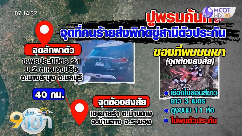 ทั้งนี้ ช่วงบ่ายวานนี้ (21 มี.ค. ) ตำรวจลงพื้นที่ตรวจสอบกล้องวงจรปิดตลอดเส้นทางที่คนร้ายใช้ก่อเหตุ ตั้งแต่หมู่บ้านผู้เสียหาย ไปจนถึงโรงเรียนนานาชาติ ระยะทางรวมกันกว่า 3.2 กิโลเมตร มีกล้องของชาวบ้านจับภาพช่วงเวลา 08.48 น. พบรถยนต์ของผู้เสียหายขับผ่าน และทิ้งระยะห่างไม่ถึง 1.20 นาที มีคนของคนร้าย เป็นรถมิตซูบิชิปาเจโรสีดำ ขับตามมาอย่างรวดเร็ว จากนั้นกล้องอีกมุมจับภาพคนร้ายขี่รถจักรยานยนต์ที่ใช้ก่อเหตุปาดหน้า แล้วลักพาตัวผู้เสียหายไป ลักษณะของคนร้ายเป็นชาวจีน 2 คน สวมหมวกกันน็อกแบบเต็มใบ สวมถุงมือสีขาวทั้ง 2 คน ขี่รถจักรยานยนต์ สะกดรอยตามรถของผู้เสียหาย ก่อนจะลงมือก่อเหตุลักพาตัว