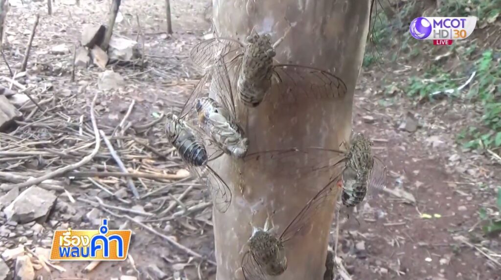 ชาวบ้านหมู่ 18 บ้านแม่นาเรือ อ.เมือง จ.พะเยา นำถุงไปเก็บจักจั่นริมอ่างเก็บน้ำแม่นาเรือ หลังจากนำลำไม้มาปักใกล้ๆ แอ่งน้ำ ได้ฝูงจักจั่นจำนวนมากที่เกาะตามลำไม้ จับใส่ถุงพลาสติกด้วยความชำนาญมาก จากสภาพอากาศที่ร้อนแล้งในช่วงนี้ ทำให้ฝูงจักจั่นบินออกจากป่าลงมากินน้ำตามลำห้วยและแหล่งน้ำชุมชน เสียงร้องดังก้อง เป็นสัญญาณบ่งชี้ถึงความแล้ง จึงจับไปปรุงอาหาร และขายให้พ่อค้าแม่ค้าแมลงทอด สร้างรายได้เป็นอย่างดี