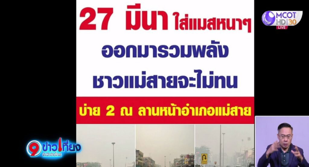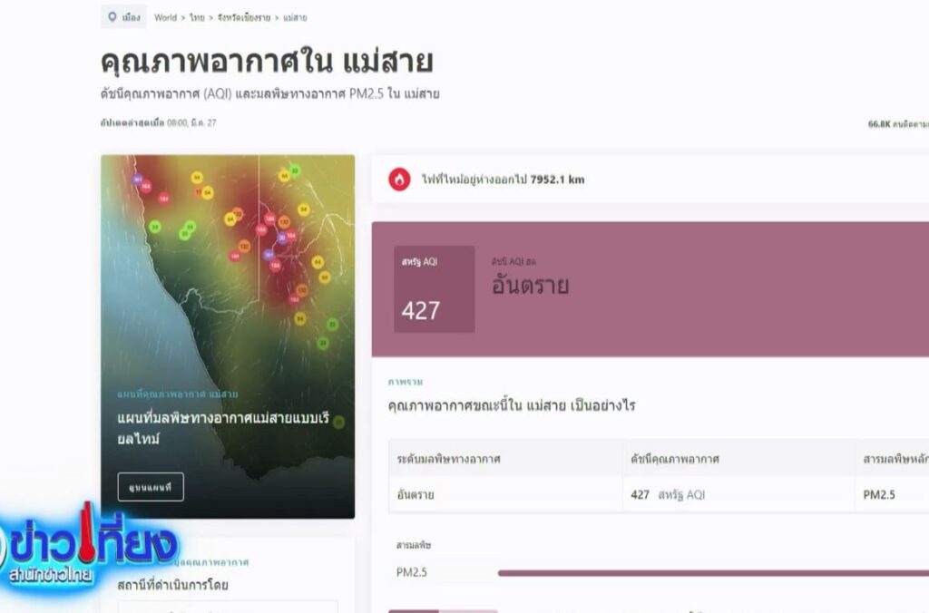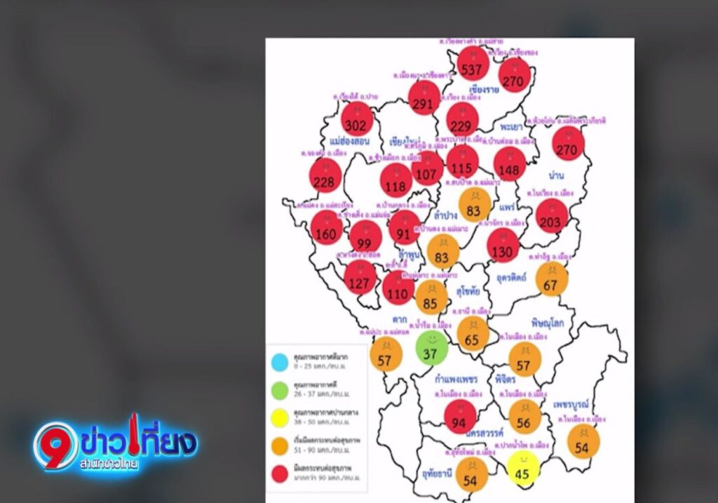 ภูมิภาค 27 มี.ค. – ภาคเหนือ PM 2.5 พุ่งสูง ชาวบ้านได้รับผลกระทบถ้วนหน้า เชียงใหม่ คุณภาพอากาศแย่เป็นอันดับ 1 ของโลก ติดต่อกันเป็นวันที่ 3 อำเภอเชียงดาว PM2.5 สูงสุด เกินค่ามาตรฐานถึง 14 เท่า ทส.ประสาน 17 จังหวัดภาคเหนือคุมเข้มไฟป่าหมอกควัน