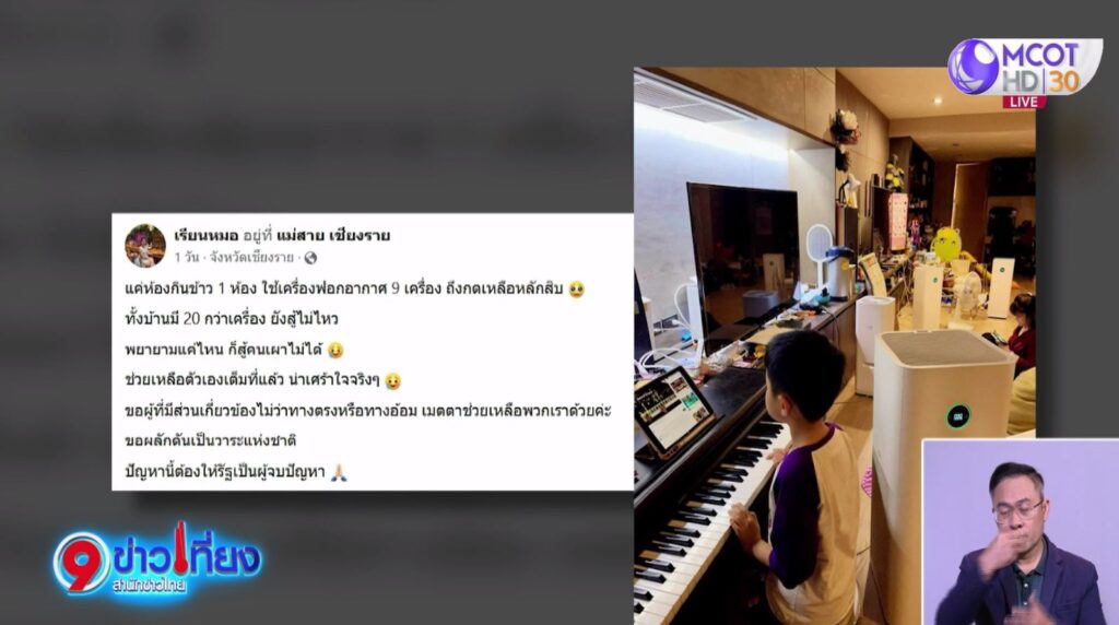 ทางด้านเพจดัง อย่าง เพจ “เรียนหมอ” ได้โพสต์สะท้อนปัญหา PM 2.5 ของ จ.เชียงราย เป็นภาพเด็กชายคนหนึ่ง นั่งเล่นดนตรีอยู่ในห้อง โดยมีเครื่องฟอกอากาศในภาพถึง 4 ตัว พร้อมระบุข้อความ “แค่ห้องกินข้าว 1 ห้อง ใช้เครื่องฟอกอากาศ 9 เครื่องถึงกดเหลือหลักสิบ ทั้งบ้านมี 20 กว่าเครื่อง ยังสู้ไม่ไหว พยายามแค่ไหน ก็สู้คนเผาไม่ได้ ช่วยเหลือตัวเองเต็มที่แล้ว น่าเศร้าใจจริงๆ ขอผู้ที่มีส่วนเกี่ยวข้อง เมตตาช่วยเหลือพวกเราด้วยค่ะ ขอผลักดันเป็นวาระแห่งชาติ ปัญหานี้ต้องให้รัฐเป็นผู้จบปัญหา”