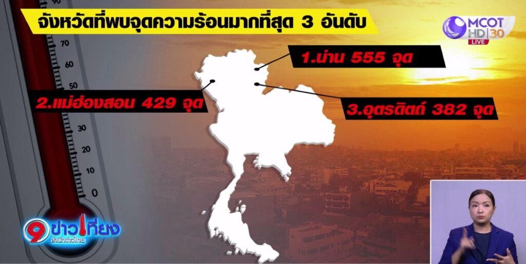 GISTDA สรุปจุดความร้อนเมื่อวานนี้ (27 มี.ค.) ไทยพบจุดความร้อน 5,396 จุด เพื่อนบ้านอย่างพม่ายังครองแชมป์อยู่ 6,877 จุด, รองลงมา สปป.ลาว 4,076 บาท, กัมพูชา 739 จุด, เวียดนาม และ มาเลเซีย สำหรับจุดความร้อนในไทย ส่วนใหญ่พบในพื้นป่าอนุรักษ์ 3,024 จุด รองลงมา พื้นที่ป่าสงวนแห่งชาติ พื้นที่เกษตร 251 จุด จังหวัดที่พบจุดความร้อนมากที่สุด 3 อันดับ คือ น่าน 555 จุด รองลงมา แม่ฮ่องสอน 429 จุด และอุตรดิตถ์ 382 จุด