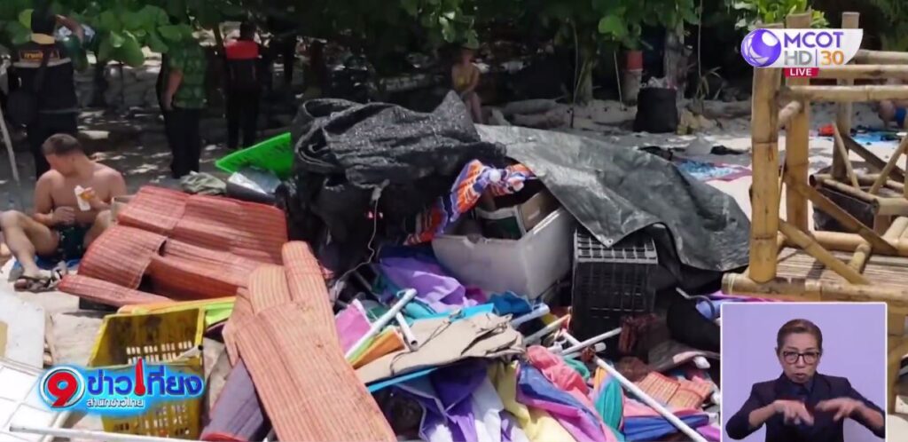 จากการลงพื้นที่ มีนักท่องเที่ยวชาวต่างชาตินอนอาบแดดเป็นจำนวนมาก นอกจากนี้ยังพบโต๊ะ เก้าอี้ และเตียงร่วมผ้าใบจำนวนหนึ่ง แต่ไม่มีผู้ใดแสดงตัวเป็นเจ้าของ ทางเจ้าหน้าที่จึงรื้อและเก็บรวบรวมสิ่งของไว้เป็นของกลางในการดำเนินคดี