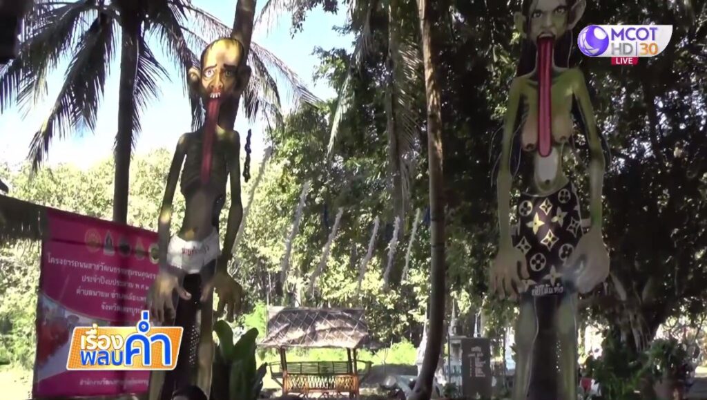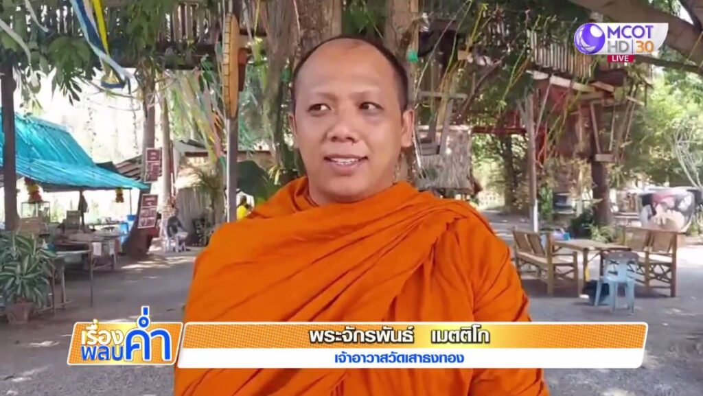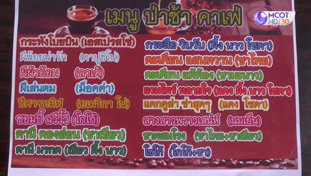 พระจักรพันธ์ เมตติโก เจ้าอาวาสวัดเสาธงทอง เล่าถึงที่มาของชื่อป่าช้าคาเฟ่ จากพื้นที่รกร้างให้เป็นพื้นที่สะอาดร่มรื่น เหมาะกับการมานั่งพักผ่อนหย่อนใจ เพราะจุดเด่นของวัดนี้มีต้นไม้ใหญ่เกี่ยวเนื่องในพุทธประวัติ ร้านกาแฟก็สร้างรายได้มาปรับปรุงพัฒนาพื้นที่ จากเคยเป็นป่าช้าเก่า ซึ่งเป็นพื้นที่เก็บอัฐิ เลยตั้งชี่อร้านกาแฟว่า ป่าช้าคาเฟ่ และเมนูที่สอดคล้องกับป่าช้า ยอดขายแต่ละวัน จาก 30-40 แก้ว พุ่งขึ้นวันละ 200-300 แก้ว และแคมเปญล่าสุด ได้สร้างหุ่นผีและภาพวาดผีให้เป็นสื่อคติสอนใจให้ทุกคนเร่งรีบทำความดีตายไปจะได้ไม่ต้องมาเป็นผีเฝ้าป่าช้าอย่างที่เห็น. – สำนักข่าวไทย