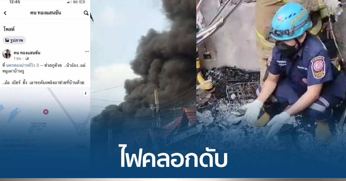 ทั้งนี้พบว่า ก่อนเกิดเหตุเพลิงไหม้ ผู้เสียชีวิตได้โพสต์ Facebook ส่วนตัวชื่อ “ฅน ทองแสนขัน” ว่า “ที่นครทองปาร์ควิว3 ช่วยกุด้วย ….น้าอ๋อง แม่หมูเผาบ้านกู …อ๋อ เบียร์ ยั้ง เอารถดับเพลิงมาช่วยที่บ้านด้วย”