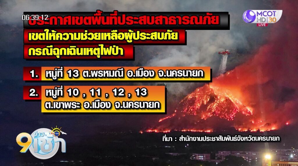 นครนายกฯ 31 มี.ค. – ไฟป่านครนายกปะทุซ้ำกลางดึก หลังเจอกระแสลมแรง ด้านจังหวัดนครนายกประกาศ 2 เขตภัยพิบัติแล้ว ขณะ ก.ทรัพยากรธรรมชาติฯ จะนำเฮลิคอปเตอร์ เสริมอีกลำวันนี้