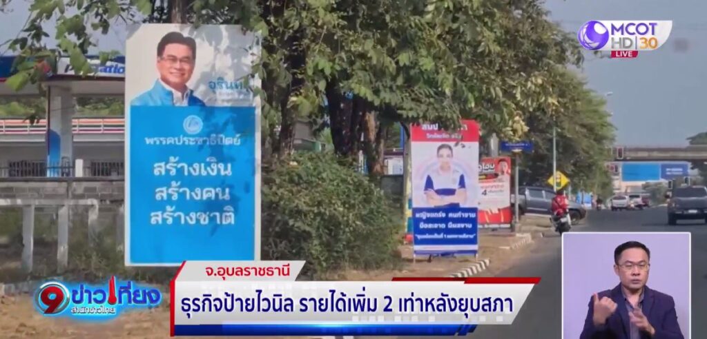 นายธนบดี ขันติกุล เจ้าของธุรกิจปริ้นป้ายไวนิล บอกว่า หลังมีการยุบสภาและประกาศให้มีการเลือกตั้งใหม่ ธุรกิจป้ายในพื้นที่จังหวัดอุบลราชธานี ทั้งงานพิมพ์ งานโครงไม้ การติดตั้ง มีรายได้หมุนเวียนเพิ่มขึ้นกว่า 2 เท่า ทำให้ทางร้านต้องสตอกผ้าไวนิล สี และโครงไม้ เพื่อให้เพียงพอต่อความต้องการของลูกค้า