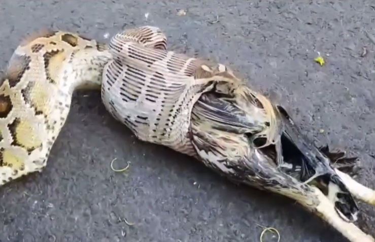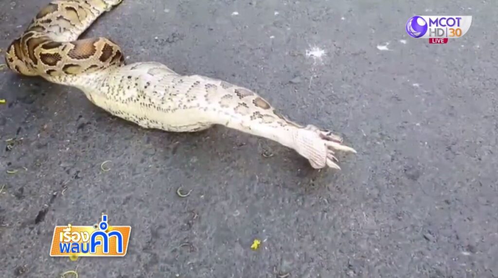 สุรินทร์ 5 เม.ย. – งูเหลือมขนาดใหญ่เขมือบไก่เข้าไปทั้งตัว เลื้อยหนีไม่ได้เพราะติดพุงจนต้องขย้อนเหยื่อออกมา