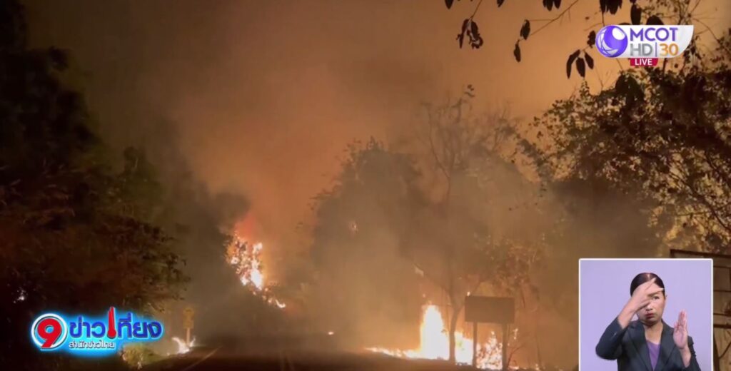ไฟโหมลุกไหม้อย่างหนักบริเวณชายแดนไทย-เมียนมา เขตติดต่อหมู่บ้านผาบือและหมู่บ้านลาบา บนพื้นที่โครงการพัฒนาดอยตุง ต.แม่ฟ้าหลวง อ.แม่ฟ้าหลวง จ.เชียงราย โดยไฟได้ไหม้ผืนป่าและหญ้าแห้งจนเกิดเป็นเปลวไฟเต็มขุนเขา รวมทั้งพื้นที่ที่อยู่ติดกับถนนเลียบชายแดนไทย-เมียนมา และได้ลุกลามอย่างรวดเร็ว