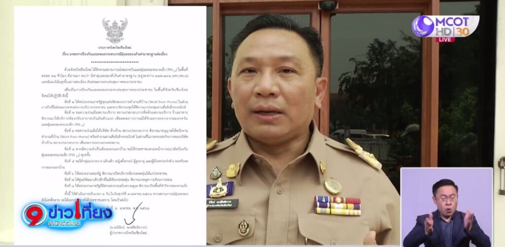นายนิรัตน์ พงษ์สิทธิถาวร ผู้ว่าราชการจังหวัดเชียงใหม่ ลงนามในประกาศมาตรการลดผลกระทบจากหมอกควันฝุ่นพิษ รวม 8 มาตรการหลัก คือ ขอให้ชาวเชียงใหม่ที่อยู่ในกลุ่มเปราะบาง ทั้งเด็ก คนชรา และผู้ที่มีโรคประจำตัว ให้ลดหรืองดออกจากบ้าน หากมีความจำเป็นต้องใส่หน้ากากอนามัยทุกครั้ง ศูนย์เด็กเล็กที่ไม่มีห้องปลอดฝุ่น ให้พิจารณาปิด พร้อมขอความร่วมมือหน่วยงานรัฐและเอกชนให้ทำงานอยู่ที่บ้านในวันนี้ 1 วัน เพื่อประเมินสถานการณ์ . – สำนักข่าวไทย