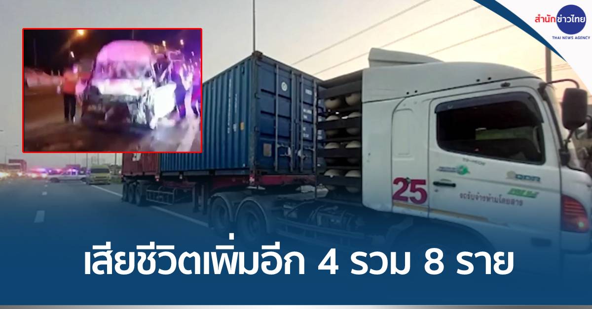 ชลบุรี 9 เม.ย.-ความคืบหน้าเหตุรถตู้ขนแรงงานต่างด้าวจากกรุงเทพฯ ไปต่ออายุบัตรที่จันทบุรี ชนท้ายรถพ่วง บนถนนมอเตอร์เวย์ ขาเข้าพัทยา ล่าสุดมีผู้เสียชีวิตเพิ่มอีก 4 ราย รวมเป็น 8 ราย ตร. คาดคนขับรถตู้อาจหลับใน รอตรวจสอบวงจรปิดอีกครั้ง