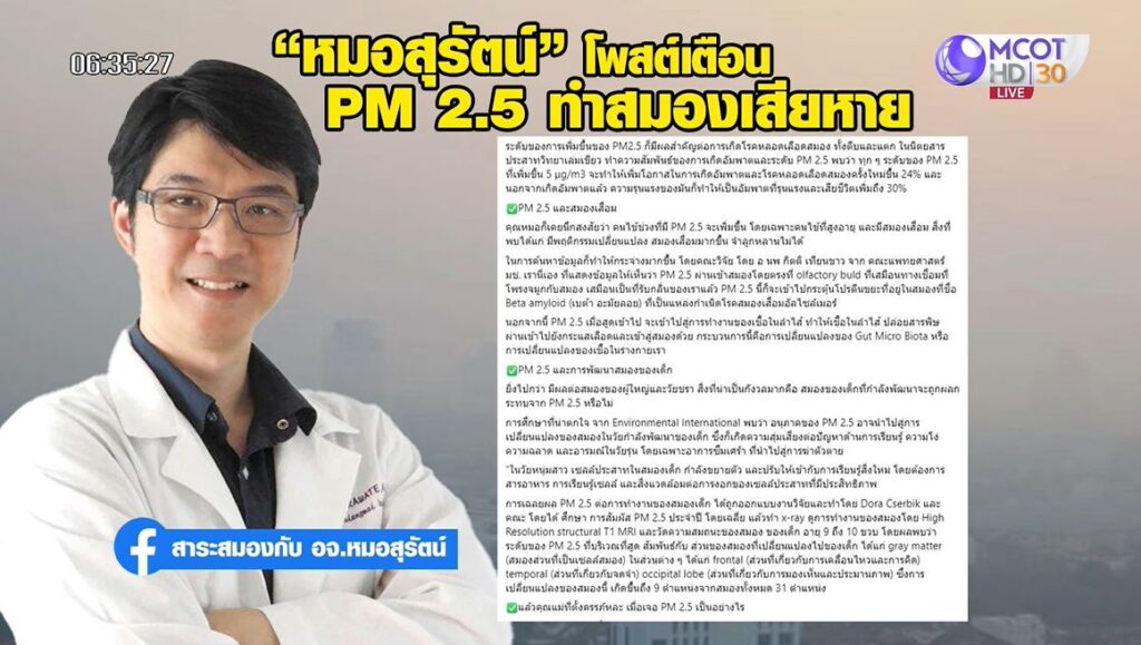 ผศ.นพ.สุรัตน์ ตันประเวช หัวหน้าหน่วยประสาทวิทยา ภาควิชาอายุรศาสตร์ และเลขานุการ และกรรมการบริหารศูนย์โรคสมองภาคเหนือ คณะแพทยศาสตร์ มหาวิทยาลัยเชียงใหม่ กล่าวว่า ฝุ่น PM 2.5 ที่เกิดขึ้นในปีนี้ถือว่าเลวร้ายที่สุดในรอบ 10 ปี โดยผลการวิจัยที่ออกมาล่าสุดในปี 2566 ที่เป็นวารสารวิชาการด้านเซลล์ประสาทวิทยา หรือฝุ่น PM 2.5 ทำลายสมอง พบว่านอกจากฝุ่น PM 2.5 จะมีผลเสียต่อหลอดเลือดและปอดแล้ว ยังมีผลต่อสมองอย่างร้ายแรง ขนาดที่เล็กมากกว่าเส้นผม 50 เท่าของฝุ่น PM 2.5 สามารถแทรกเข้าหลอดเลือดผ่าน 2 ช่องทาง คือ 1.ผนังกั้นปอด การแลกเปลี่ยนแก๊ส และกระแสเลือด และ 2.ลำไส้ ไมโครเบียล และสมอง โดยจะทำให้เกิดภาวะ Oxidative stress หรือที่เรียกว่า ความเครียดของเซลล์หลอดเลือด ก่อนที่ฝุ่นจะกระตุ้นให้เซลล์หลอดเลือดทำงานผิดปกติ ไม่ยืดหยุ่น และอักเสบตามมา