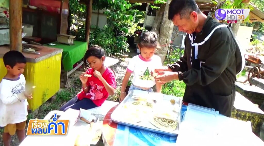 พาไปที่บ้านสวนนายเกียรติวิชญ์ เอียดนุ่น อายุ 50 ปี เป็นเจ้าหน้าที่โรงพยาบาลตรัง แต่หารายได้พิเศษด้วยการเลี้ยงผึ้งโพรง หรือภาษาถิ่นใต้ เรียกว่า มิ้นโต เลี้ยงไว้กว่า 30 รัง บนเนื้อที่ 3 ไร่ ใช้เวลา 3 เดือน ก็ทยอยเก็บน้ำผึ้งขายได้ เฉลี่ยปีละ 4 ครั้ง ส่วนวิธีขายนั้น แทนที่จะกรองน้ำผึ้งขายเป็นขวด แต่คุณเกียรติวิชญ์ ได้เปลี่ยนมาขายแบบกล่องแทน เพื่อให้ลูกค้าเกิดความมั่นใจในคุณภาพ ได้เห็นทั้งรังผึ้ง ตัวอ่อนของผึ้ง และได้ชิมน้ำผึ้งสด ๆ จากรัง ในราคาที่จับต้องได้ มี 2 ราคา คือ ตัวอ่อนของผึ้งขายกล่องละ 50 บาท ส่วนรังที่มีแต่น้ำผึ้งไม่มีตัวอ่อน ขายกล่องละ 100 บาท ราคาถูกกว่าแบบขวด 4-5 เท่า