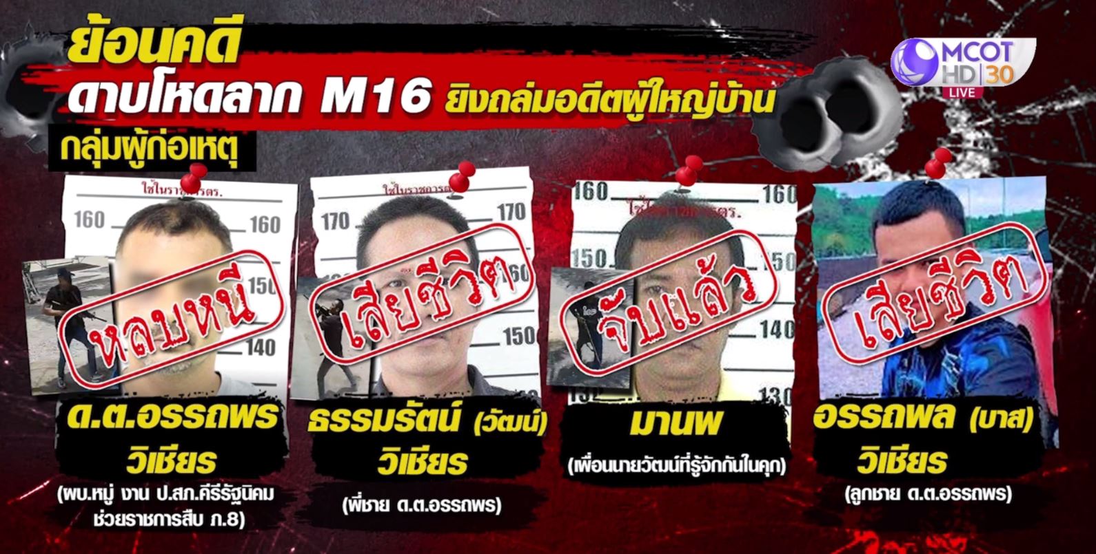 กว่า 50 ชม. เจ้าหน้าที่ยังคงออกติดตามไล่ล่า ด.ต.อรรถพร ผบ.หมู่ สภ.คีรีรัฐนิคม อ.คีรีรัฐนิคม จ.สุราษฎร์ธานี หลังร่วมกับพวกอย่างน้อย 4 คน ก่อเหตุใช้อาวุปืนสงครามเอ็ม 16 ปืนพกสั้น ปืนลูกซองยาว บุกยิงถล่ม พ่อตา หรือนายธรรมรงค์ หรือ ผู้ใหญ่รงค์ อดีตผู้ใหญ่บ้าน หมู่ 1 นางนิลทิพย์ ภรรยาของผู้ใหญ่รงค์ และนายพรศักดิ์ หรือผู้ใหญ่กรอก อดีตผู้ใหญ่บ้านหมู่ 13 เสียชีวิต ขณะอยู่ภายในบ้านพักในสวนปาล์ม พื้นที่หมู่ 8 ต.กะเปา อ.คีรีรัฐนิคม จ.สุราษฎร์ธานี โดยในที่เกิดเหตุยังพบศพของนายธรรมรัตน์ หรือ วัฒน์ พี่ชายของ ด.ต.อรรถพร ซึ่งคาดว่าถูกกลุ่มของผู้ตายยิงตอบโต้ เสียชีวิตในที่เกิดเหตุด้วย นับเป็นเหตุการณ์อุกอาจสะเทือนขวัญที่เกิดขึ้นในช่วงเวลากลางวันของวันที่ 8 เมษายนที่ผ่านมา ซึ่งมีผู้เสียชีวิตในคราวเดียวกันถึง 4 ศพ