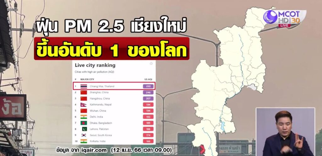 พื้นที่ตำบลสุเทพ ต.ศรีภูมิ และ ต.ช้างเผือก ค่า PM 2.5 อยู่ระหว่าง 124 – 142 ไมโครกรัมต่อลูกบาศก์เมตร ส่วน อ.เชียงดาว สูงที่สุด 246 ไมโครกรัมต่อลูกบาศก์เมตร สาเหตุมาจากการลักลอบเผาอย่างต่อเนื่อง จุดความร้อนของเช้าวันนี้น่าจะสูงสุดในรอบปี โดยพื้นที่ อ.พร้าว มากที่สุด 65 จุด รองลงมา อ.เชียงดาว 62 จุด อ.เวียงแหง 22 จุด อ.แม่แตง 21 จุด อ.สะเมิง 19 จุด และกระจายเกือบทุกอำเภอ ทำให้เว็บไซต์ไอคิวแอร์ ยังจัดอันดับให้เชียงใหม่มีคุณภาพอากาศแย่อันดับ 2 ของโลก ช่วงวลา 07.00 น. ที่ผ่านมา . – สำนักข่าวไทย