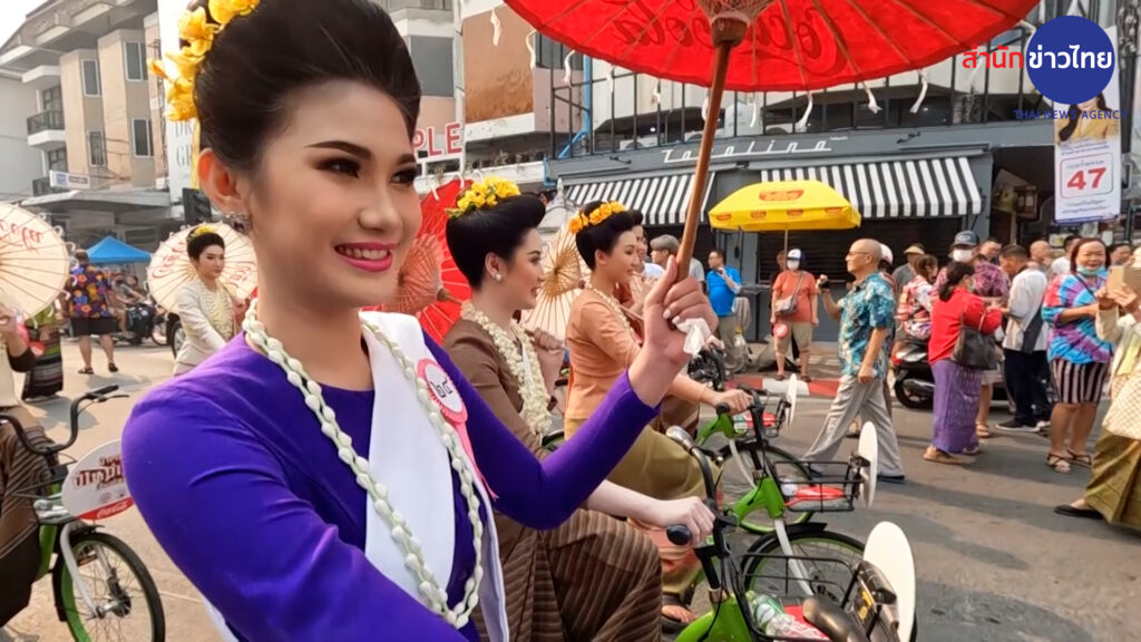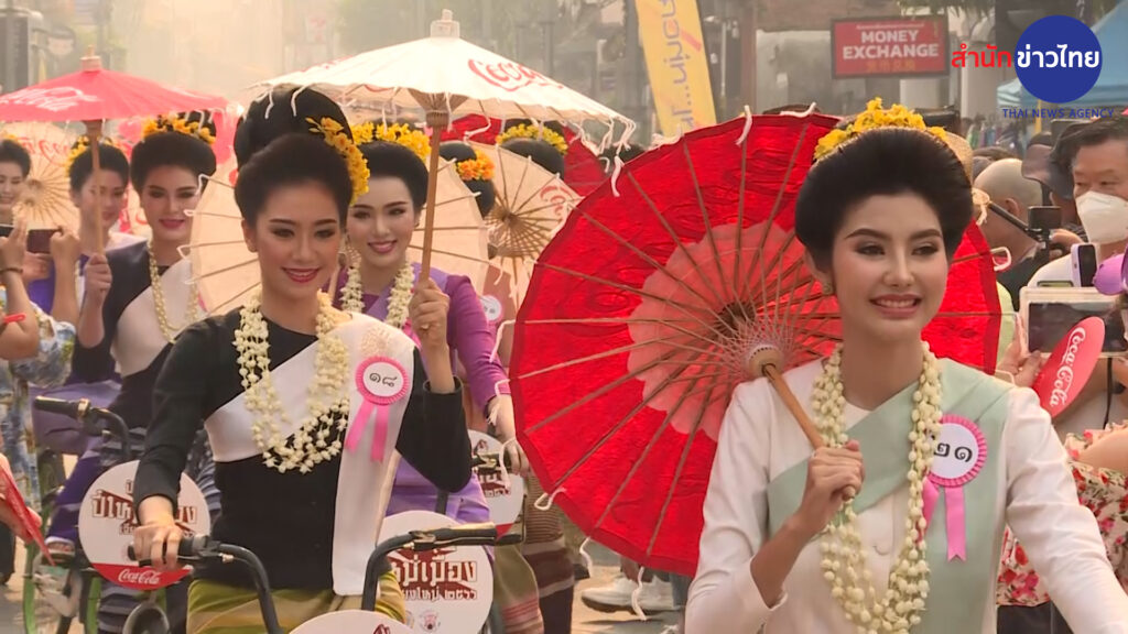 ก่อนที่นายนิรัตน์ พงษ์สิทธิถาวร ผู้ว่าราชการจังหวัดเชียงใหม่ จะเปิดงานประเพณีปี๋ใหม่เมืองหรือสงกรานต์เชียงใหม่ประจำปีนี้อย่างเป็นทางการ พร้อมกับการแสดงศิลปวัฒนธรรมบ้านนาที่สวยสดงดงาม ท่ามกลางนักท่องเที่ยวทั้งไทยและต่างชาติที่เฝ้าชมความสวยงามของพิธีเปิดกันเนืองแน่นทีเดียว และที่ถือว่าเป็นสีสันและโดดเด่นที่สุดของเช้าวันนี้เห็นจะเป็นขบวนผู้เข้าประกวดแม่ญิงขี่รถถีบกางจ้อง หรือขบวนสาวงามปั่นจักยานกางร่ม ซึ่งเป็นวิถีชีวิตของชาวล้านนาในอดีต ที่จะใช้จักรยานในชีวิตประจำวัน และกางร่มกันแดดที่ร้อนจัดในเดือนเมษายน ซึ่งสาวงามแต่ละคนเรียกว่าสวยสดงดงามจริงๆ .-สำนักข่าวไทย
