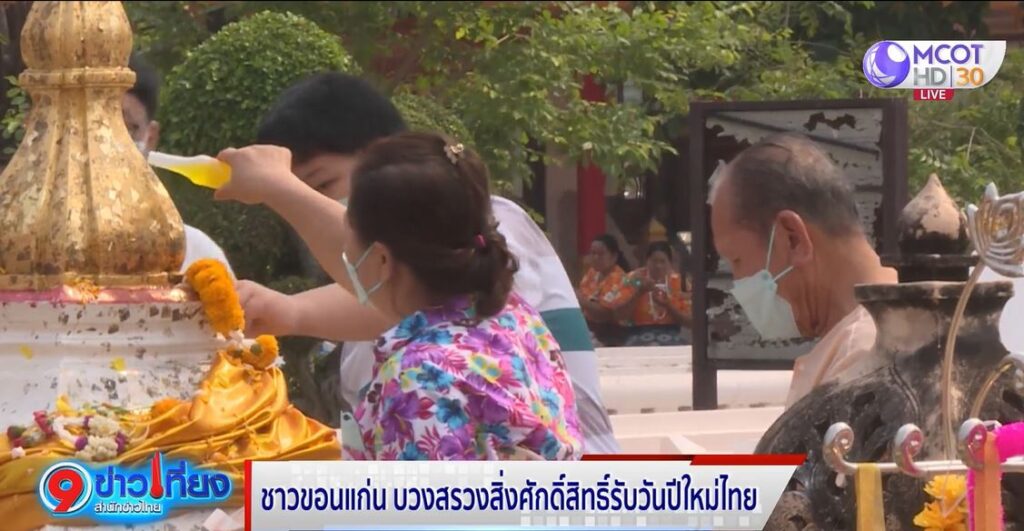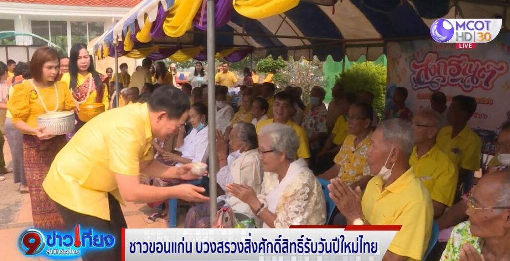 พ่อเมืองขอนแก่นอวยพรให้ประชาชนประสบแต่ความสุขความเจริญ สมหวังตามใจปรารถนาในวันขึ้นปีใหม่ไทย พร้อมแจ้งว่าขอนแก่นเป็น 1 ใน 5 จังหวัดทั่วประเทศ ในการผลักดันให้ประเพณีสงกรานต์เป็นมรดกโลก จากนั้นพ่อเมืองขอนแก่นได้รดน้ำดำหัวขอพรและมอบของที่ระลึกแก่ผู้สูงอายุ ต่อด้วยการรำอาศิรวาท โดยคณะกลองยาวลูกพระธาตุขามแก่น ทั้งนี้ ประชาชนและนักท่องเที่ยวต่างรู้สึกปลาบปลื้ม เป็นสิริมงคลที่ได้นมัสการสิ่งศักดิ์สิทธิ์ในโอกาสสำคัญนี้