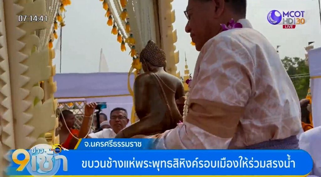 นครศรีธรรมราช 14 เม.ย. – อัญเชิญพระพุทธสิหิงค์ พระคู่บ้านคู่เมืองนครศรีธรรมราช ประดิษฐานสนามหน้าเมือง ให้ประชาชนและนักท่องเที่ยวสรงน้ำ ส่วนรองผู้ว่าฯ ยะลา นำชาวพุทธแห่ผ้าห่มพระพุทธไสยาสน์ วัดคูหาภิมุข สืบสานประเพณีสงกรานต์