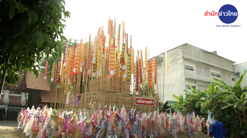 ช่วงสายแบบนี้ ตามวัดวาอารามหลายแห่งในตัวเมืองเชียงใหม่ เริ่มมีผู้คนเข้ามาทำบุญสรงน้ำพระและถวายตุงช่อตุงไชยตามเจดีย์ทรายตามประเพณีล้านนา อย่างที่วัดเจ็ดลิน วัดเก่าแก่แห่งหนึ่งของเชียงใหม่ ซึ่งมีเจดีย์ทรายสุดส้าวสูงเท่าตึก 3 ชั้น ก็มีผู้คนมาถวายตุงต่อเนื่อง ซึ่งเชื่อว่าจะช่วยให้ผู้ที่ล่วงลับไปแล้วได้เกาะชายตุงขึ้นสวรรค์ และช่วยให้ประสบความสำเร็จในช่วงปี๋ใหม่เมือง นั่นทำให้ ตลาดสดหลายแห่งในเชียงใหม่ อย่างตลาดประตูเชียงใหม่ เนืองแน่นไปด้วยผู้คนที่ไปซื้อข้าวของเครื่องใช้ ตุงช่อตุงไชย สำหรับการไปทำบุญที่วัด