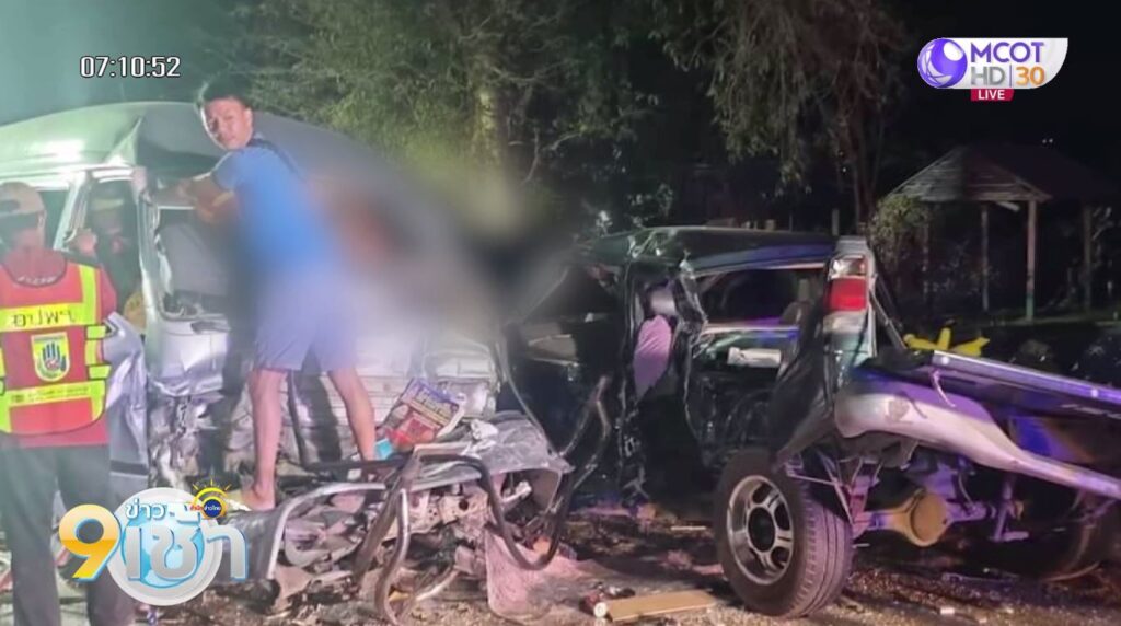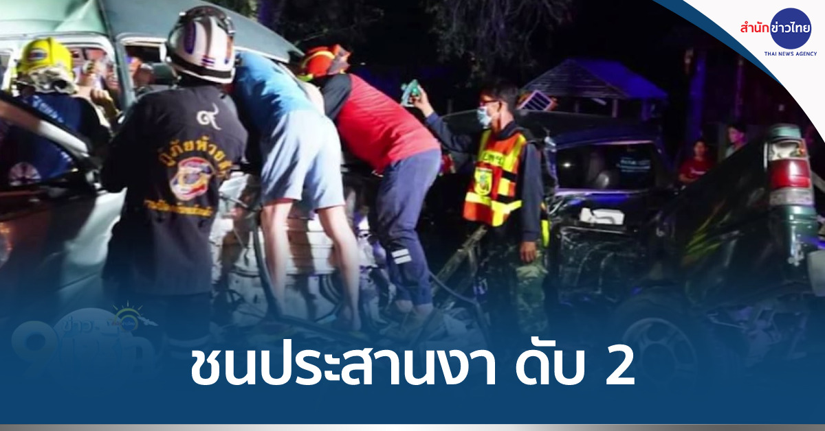 ตรวจสอบที่เกิดเหตุ ทราบว่ารถตู้มีผู้โดยสาร 13 คน ส่วนรถกระบะนั่งมา 3 คน เป็นครอบครัวเดียวกัน ขับสวนมา เมื่อถึงจุดเกิดเหตุรถทั้งสองคันชนประสานงานกันอย่างแรง ทำให้ผู้โดยสารในรถกระบะเสียชีวิต 1 ราย เป็นเด็กหญิงอายุ 14 ปี ส่วนอีก 2 คนที่นั่งมาด้วยเจ็บสาหัส หนึ่งในนั้นเป็นชายและเป็นคนขับ ส่วนรถตู้มีผู้บาดเจ็บรวม 12 ราย เจ้าหน้าที่กู้ภัยช่วยกันงัดเอาร่างออกจากรถ พร้อมนำส่งโรงพยาบาล ต่อมาพบชายคนขับรถกระบะทน เสียชีวิตอีก 1 ราย รวมมีผู้เสียชีวิต 2 ราย และบาดเจ็บ 13 ราย ซึ่งตำรวจจะสอบสวนหาสาเหตุอย่างละเอียดอีกครั้ง.-สำนักข่าวไทย