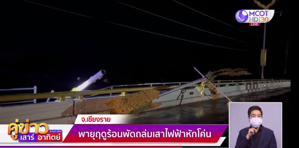 ส่วนที่ จ.เชียงราย เกิดพายุฤดูร้อนพัดถล่มและมีฝนตกหนักในหลายพื้นที่เมื่อช่วงค่ำวันที่ 21 เม.ย. ทำให้เสาไฟฟ้าประดับลวดลายศิลปะ บนถนนเวียงบูรพา กลางสะพานเฉลิมพระเกียรติฯ ข้ามแม่น้ำกก เทศบาลนครเชียงราย 2 ต้น ล้มขวางผิวจราจรฝั่งขาขึ้นมีรถติดระหว่างเสาที่ล้มลงมา 2 คัน ท่ามกลางรถที่สัญจรไปมาหนาแน่น โชคดีไม่มีใครได้รับอันตราย แต่ทำให้การจราจรฝั่งขาขึ้นติดขัดอย่างหนัก ไฟดับเป็นวงกว้าง ขณะที่พื้นที่อื่นๆ อาทิ อ.แม่สาย อ.แม่จัน อ.เวียงเชียงรุ้ง มีฝนตกตั้งแต่ช่วงเย็นถึงค่ำ และบางพื้นที่มีลูกเห็บขนาดเล็กตกปะปนมากับสายฝนด้วย จากลมฝนที่ตกลงมาครั้งนี้ส่งผลค่าฝุ่นละออง PM 2.5 ลดลงทั้งจังหวัดเป็นครั้งแรกในรอบ 2 เดือน ส่วนที่ อ.แม่จัน ซึ่งมีไฟป่าดอยจระเข้ติดต่อกันมาหลายวัน ไฟก็ดับแล้วเช่นกัน