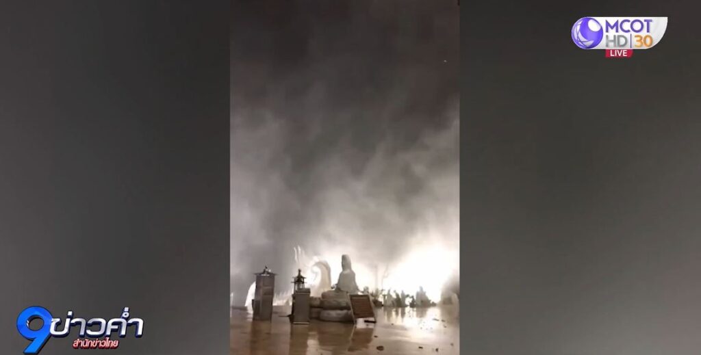 ที่ จ.เชียงราย บริเวณลานพระแม่กวนอิมองค์ใหญ่ ตั้งอยู่บนเนินสูงของวัดห้วยปลากั้ง ซึ่งเบื้องล่างเป็นขั้นบันไดมังกรและชุมชนห้วยปลากั้ง ต.ริมกก เกิดพายุหมุนบริเวณหน้าองค์เจ้าแม่กวนอิม เป็นเวลานาน ท่ามกลางฝนที่ตกลงมาอย่างต่อเนื่อง โชดคีภายในวัดไม่ได้รับความเสียหาย