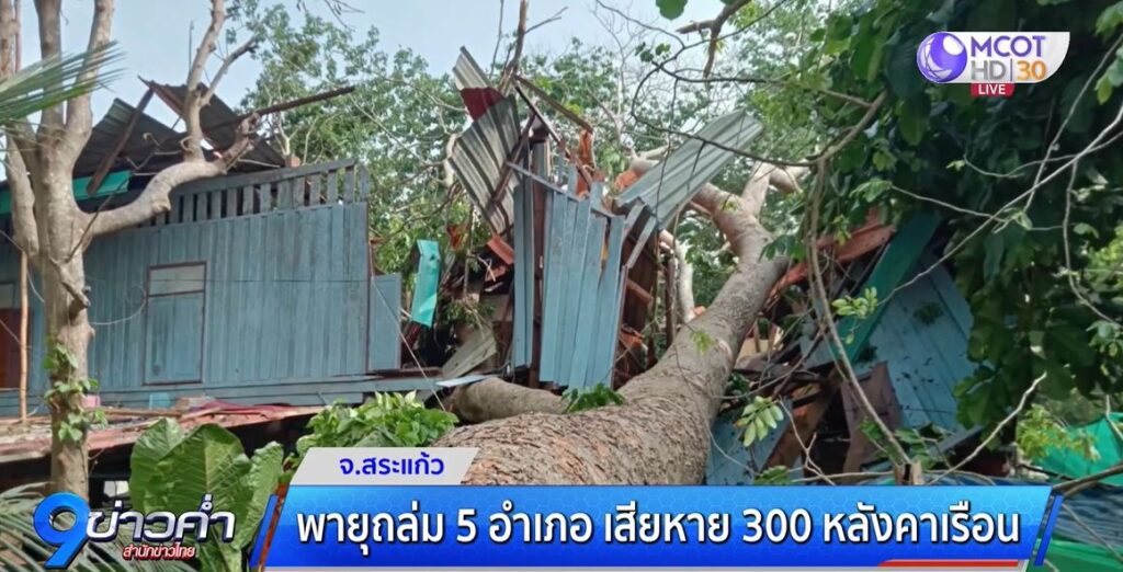 ภูมิภาค 23 เม.ย. – พายุฤดูร้อนพัดถล่ม 5 อำเภอของ จ.สระแก้ว บ้านเรือนประชาชนเสียหาย 300 หลังคาเรือน ผู้ว่าฯ สระแก้ว สั่งการทุกอำเภอเร่งสำรวจผลกระทบ