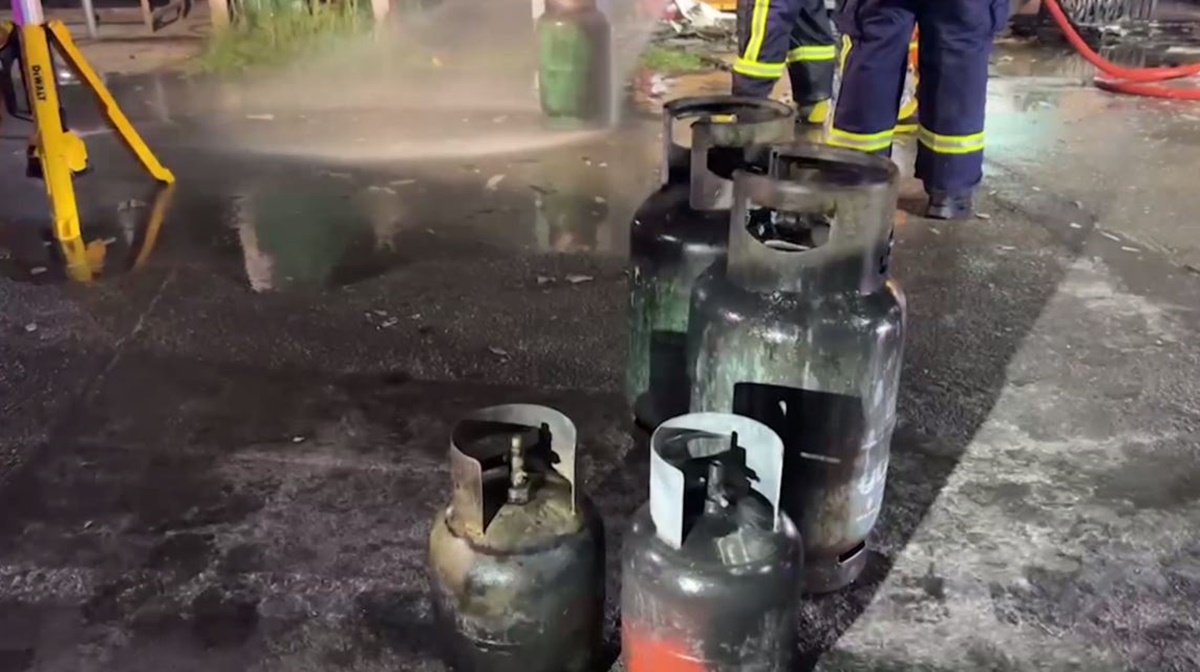 และที่อันตรายคือ ในร้านมีถังแก๊สขนาด 15 กิโลกรัม จำนวน 3 ถัง และถังแก๊สปิกนิกอีก 2 ถัง โดยถังแก๊ส 15 กิโลกรัม 1 ถัง เกิดความร้อนจนวาล์วรั่ว เปลวไฟจากแก๊สพุ่งอย่างรุนแรง เจ้าหน้าที่ต้องฉีดน้ำนานกว่า 30 นาที จึงควบคุมไว้ได้ ก่อนนำออกมาจากร้าน และปล่อยแก๊สจนหมดถัง พร้อมประกาศให้ชาวบ้านใกล้เคียงงดจุดไฟ หรือสูบบุหรี่ และจัดการจราจรให้รถสัญจรเส้นทางอื่น เพื่อป้องกันอันตรายจากแก๊สระเบิด