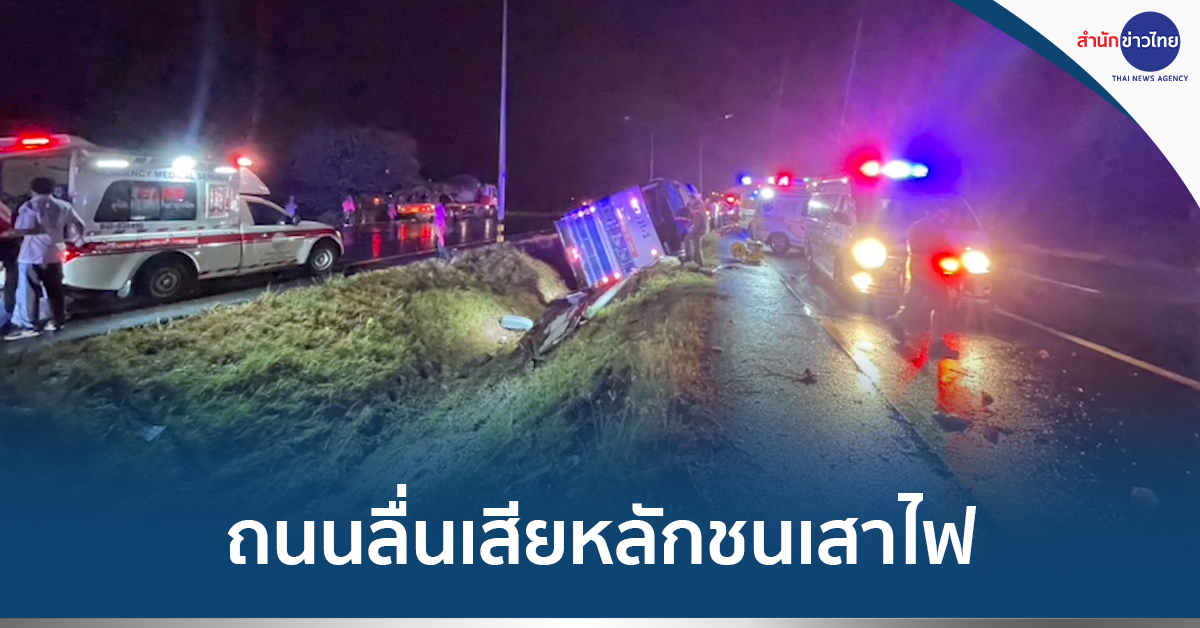 มหาสารคาม 24 เม.ย.- ฝนตกหนักถนนลื่น รถทัวร์โดยสาร “กรุงเทพฯ-อุบลราชธานี” เสียหลักพุ่งชนเสาไฟส่องสว่าง เสียชีวิต 1 ราย บาดเจ็บ 42 ราย