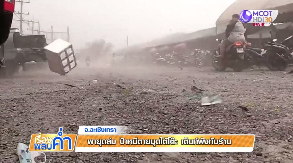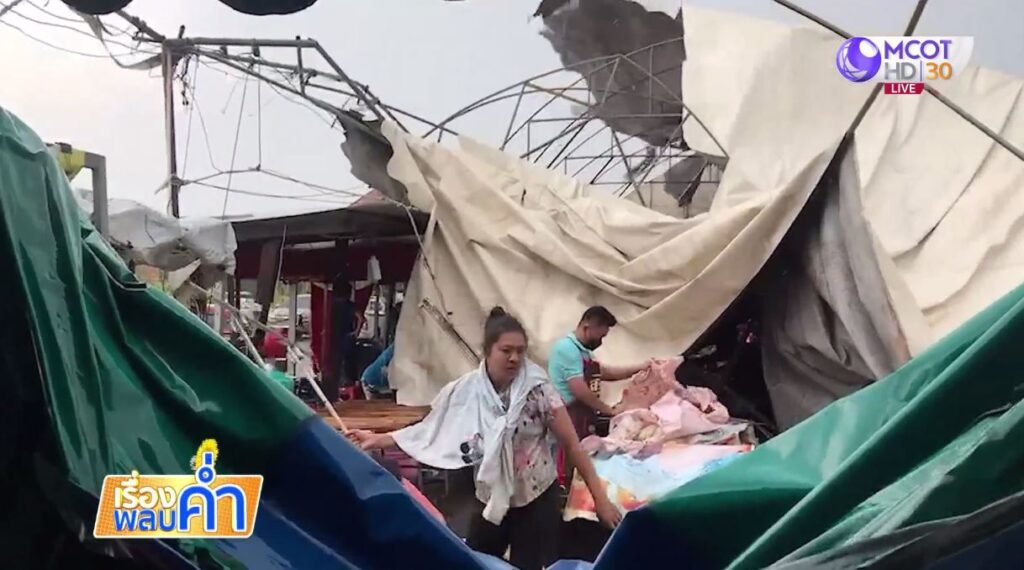 25 เม.ย. – ที่ลำลูกกา ปทุมธานี พายุฝนกระหน่ำมาพร้อมลูกเห็บ ส่วนที่ฉะเชิงเทรา เจอพายุฤดูร้อนถล่ม ลมแรง เต็นท์ใหญ่ต้านไม่ไหวเปิดเปิง ข้าวของเสียหาย แม่ค้าเล่านาทีหนีตาย มุดเข้าใต้โต๊ะ บอกเกิดมา 65 ปี ไม่เคยเจอพายุรุนแรงขนาดนี้