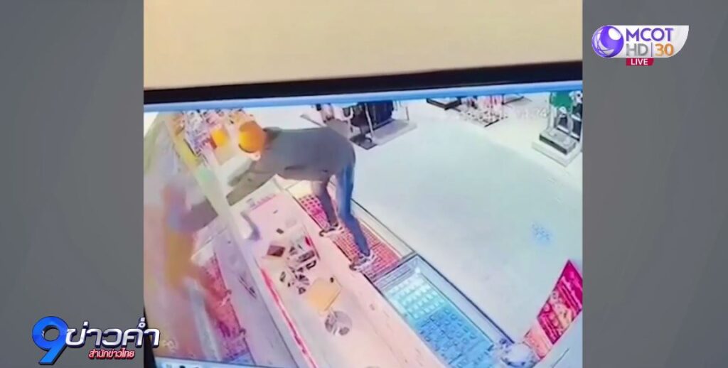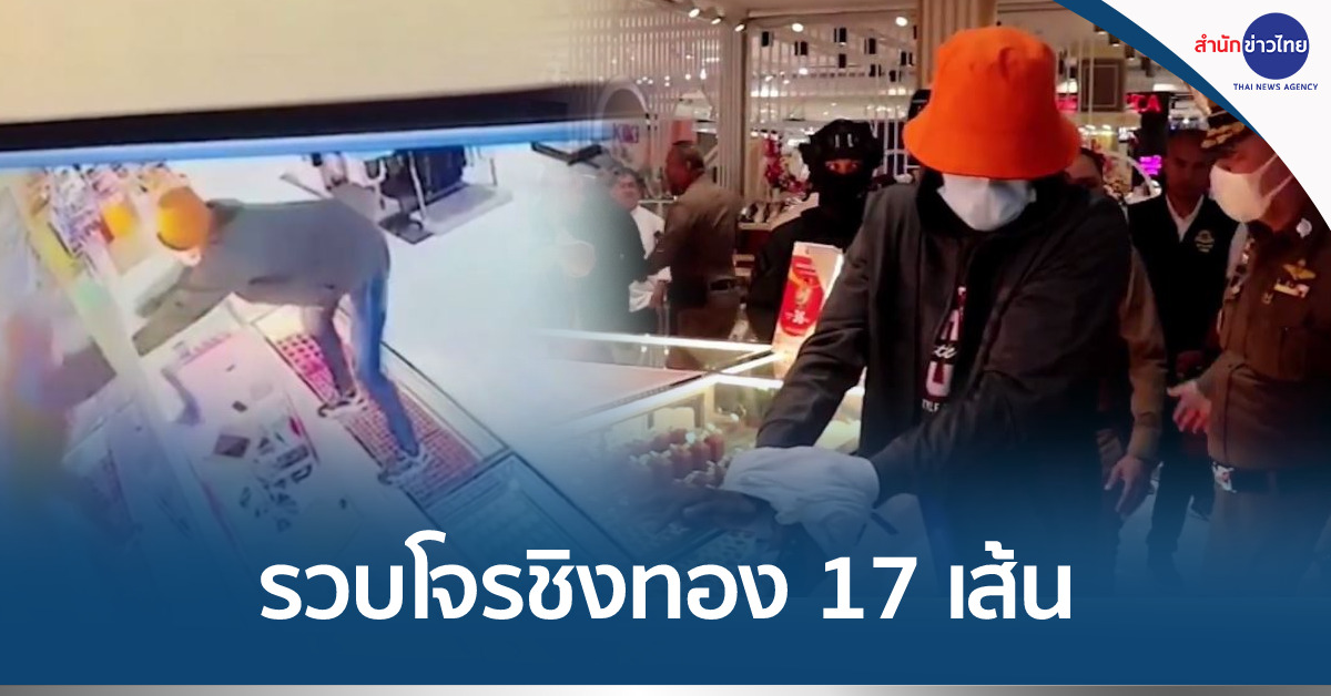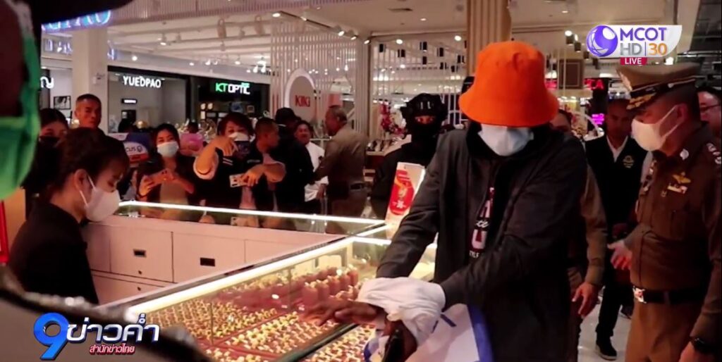 ผู้ต้องหาคนนี้คือนายฐิติพงษ์ อายุ 32 ปี เป็นชาวลพบุรี ก่อเหตุเมื่อบ่ายวันที่ 19 เมษายน โดยใช้ปืนพกสั้นจี้บังคับพนักงานหน้าร้านทอง ก่อนจะกระโดดเหยียบตู้ขึ้นไปกระชากเอาสร้อยคอทองคำน้ำหนักเส้นละ 1 บาท ที่แขวนโชว์อยู่ในตู้โชว์ไป 17 เส้น วิ่งหลบหนีออกจากห้าง แล้วขี่รถจักรยานยนต์หลบหนีไป