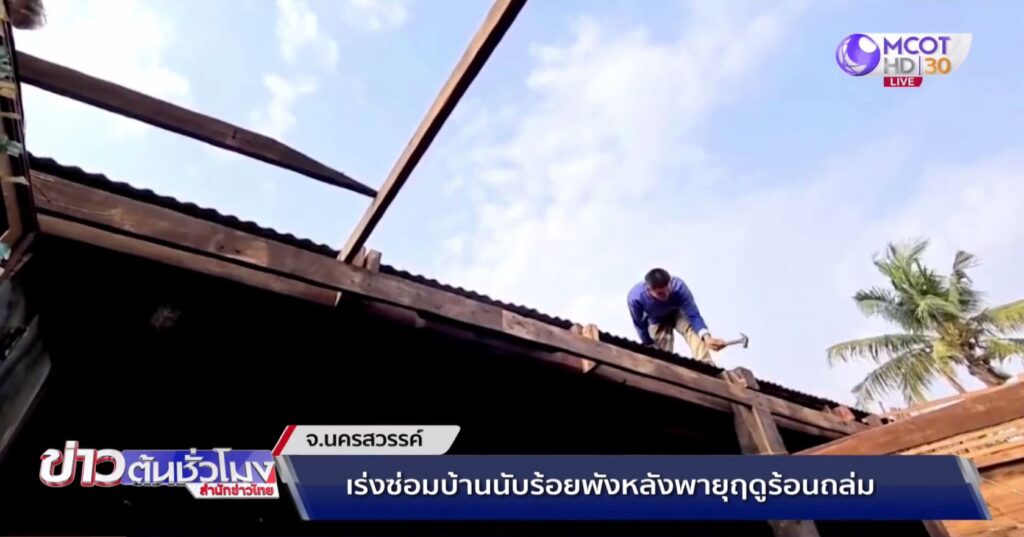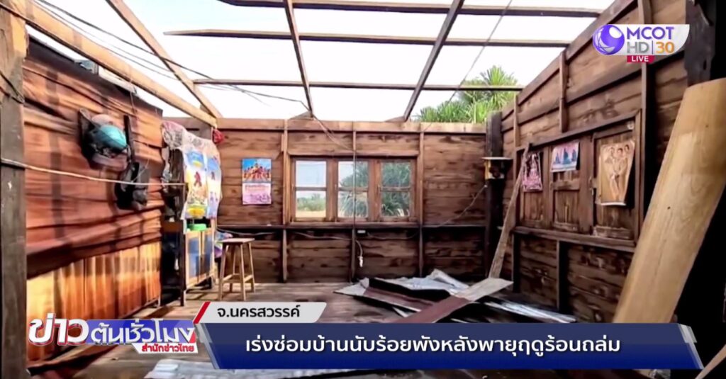 นครสวรรค์ 26 เม.ย. – บ้านประชาชนนับร้อยหลังในพื้นที่ ต.พุนกยูง อ.ตากฟ้า จ.นครสวรรค์ พังเสียหาย หลังพายุลูกเห็บพัดถล่ม เสาไฟหักโค่น เจ้าหน้าที่เร่งซ่อมแซม