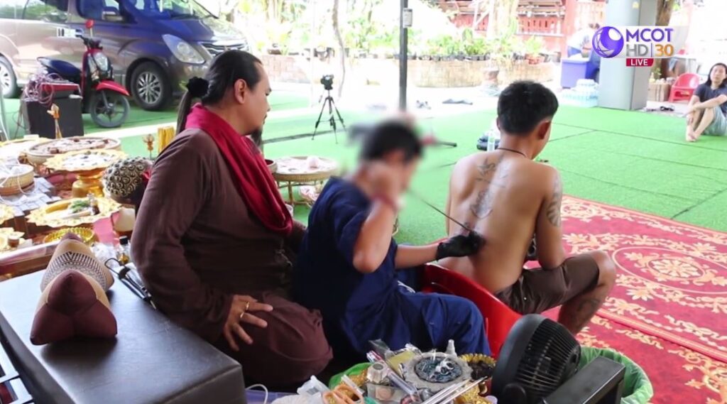 ผู้สื่อข่าวไปที่อาศรม เห็นน้องปืนกำลังสักยันต์ โดยมีอาจารย์อ้นผู้เป็นพ่อนั่งควบคุมดูการสักยันต์ ลายที่กำลังสัก คือ ยันต์ครูเสือนอนกิน ช่วยเสริมดวงและโชคลาภ น้องปืนใช้เวลาในการสักประมาณ 1 ชั่วโมงครึ่ง จากนั้นอาจารย์อ้นจะทำการครอบครูเพื่อทำพิธีปลุกเสกยันต์ตามพิธีกรรมของสำนัก