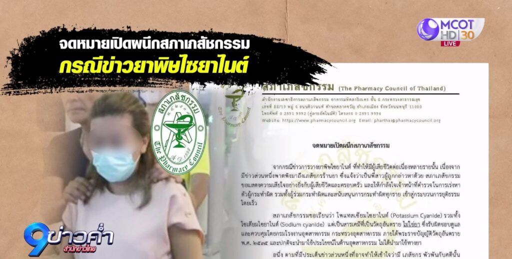 ด้านสภาเภสัชกรรม ออกแถลงการณ์กรณีสารพิษไซยาไนด์ โดยแสดงความเสียใจกับผู้เสียชีวิตและครอบครัว พร้อมระบุถึงกรณีมีประเด็นข่าวที่อาจทำให้เข้าใจว่ามีเภสัชกรเข้าไปพัวพันกับคดีนั้น ขอเรียนว่า เภสัชกรเป็นผู้ที่มีความรู้เรื่องยาและสารเคมีเพื่อใช้ในการรักษาและป้องกันโรคและต้องปฏิบัติภายใต้กรอบจรรยาบรรณของการประกอบวิชาชีพ ที่กำกับดูแลโดยสภาเภสัชกรรมอย่างเคร่งครัด หากการสืบสวนสอบสวน ขยายผลแล้ว พบว่าผู้ประกอบวิชาชีพเภสัชกรรมรายใดมีส่วนเกี่ยวพันในการกระทำผิดจริง สภาเภสัชกรรมพร้อมจะพิจารณาโทษทางจรรยาบรรณ ภายใต้อำนาจหน้าที่ตามข้อบังคับว่าด้วยจรรยาบรรณวิชาชีพ อย่างเคร่งครัด