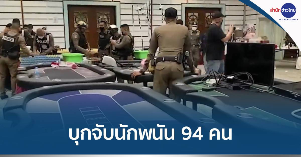 ชลบุรี 1 พ.ค.-บุกจับกุมนักพนันทั้งหมด 94 คน ในโรงแรมเมืองพัทยา ยึดของกลาง ร่วมกว่า 200 ล้านบาท นำตัวทั้งหมดฝากขัง 3 โรงพัก เร่งสอบสวนโรงแรมเกี่ยวข้องหรือไม่