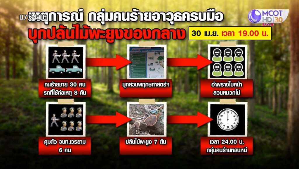 มุกดาหาร 3 พ.ค. – ผู้บังคับการตำรวจภูธรจังหวัดมุกดาหาร สั่งตรวจสอบกรณีกลุ่มคนร้ายกว่า 30 คน บุกปล้นไม้พะยูงของกลางจำนวน 7 ท่อน จากสวนพฤกษศาสตร์ดงมะอี่ อ.หนองพอก จ.ร้อยเอ็ด เร่งตรวจสอบกล้องวงจรปิดตามเส้นทางที่คาดว่าจะหลบหนี