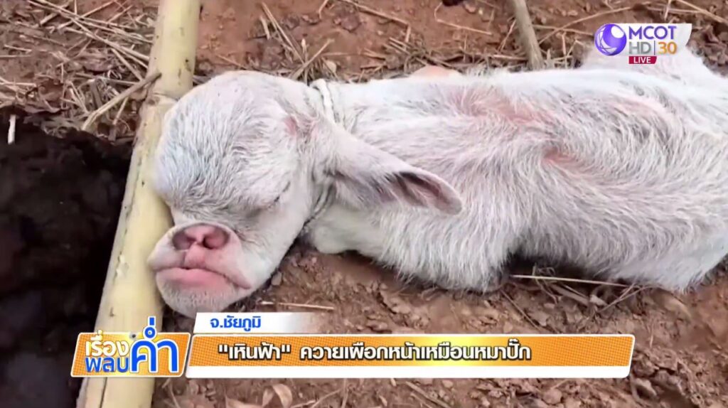 ชัยภูมิ 3 พ.ค. – ชาวบ้านที่ชัยภูมิ ฮือฮา “เจ้าเหินฟ้า” ลูกควายเผือก ออกมาหน้าคล้ายหมาปั๊ก ชาวบ้านต่างพากันขอโชคลาภ ตีเป็นเลขเด็ดลุ้นโชค เจ้าของเชื่อจะนำโชคลาภมาให้