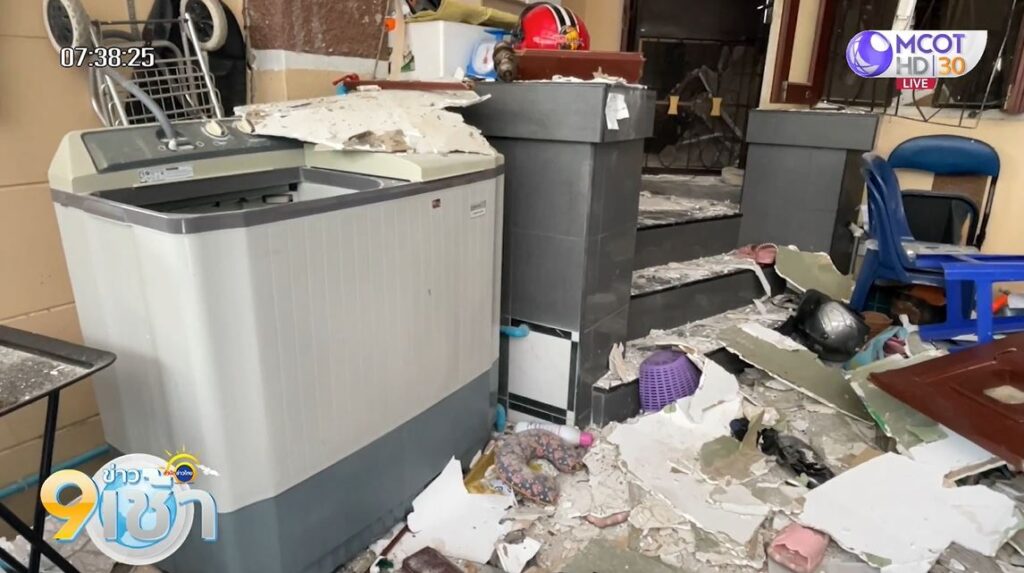 ทีมข่าวลงพื้นที่เกิดเหตุไปพบกับนายวีระพัฒน์ อายุ 39 ปี เจ้าของบ้านเกิดเหตุ เล่าว่า วันเกิดเหตุตนไปทำงาน ไม่ได้อยู่บ้าน ลูกชายอยู่บ้านคนเดียว หลังเกิดเหตุพบว่ามีบ้านที่ได้รับความเสียหายทั้งหมด 8 หลัง ที่บ้านตนซึ่งเป็นบ้านเกิดเหตุ ฝ้าถล่มทั้งหลังตั้งแต่ชั้น 1-3 ห้องครัวหลังคาหลุดหายไปทั้งหมด เฟอร์นิเจอร์ เครื่องใช้ไฟฟ้า หลังคาบ้านมีรอยรั่วและฝ้าหล่นลงมา ส่วนบ้านใกล้เคียงได้รับความเสียหายมีแผ่นฝ้าหล่น กระจกแตก หลังคาทะลุ ตอนนี้ยังไม่ทราบสาเหตุว่าเกิดจากอะไร แต่ในถังแก๊สไม่มีแก๊สเหลืออยู่ เจ้าหน้าที่พิสูจน์หลักฐานได้นำถังแก๊สไปตรวจสอบแล้ว