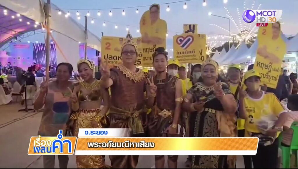 ที่ตลาดกลางผลไม้อำเภอแกลง จ.ระยอง สถานที่จัดงานเทศกาลผลไม้และของดีเมืองแกลง นายทฤษฎี ธนาบริบูรณ์ ผู้สมัคร ส.ส. เขต 3 พรรคไทยภักดี แต่งตัวเป็นพระอภัยมณี ควงนางยักษ์ นางเงือก และลูกชายสุดสาคร พร้อมทีมงานชูป้าย เดินแนะนำตัวทั่วงาน เป็นที่ชื่นชอบของชาวบ้าน มาขอถ่ายรูปกันจำนวนมาก