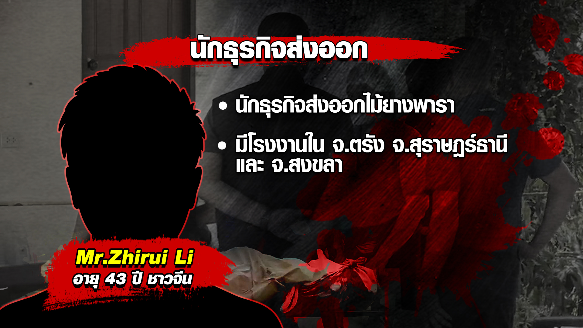 วงจรปิดของรีสอร์ตหรู ในพื้นที่ ต.ทับเที่ยง อ.เมือง จ.ตรัง จับภาพรถเก๋งสีขาว กำลังขับออกจากรีสอร์ต ในช่วงเวลา 02.23 น. ของวันที่ 15 พ.ค.66 รถคันนี้เป็นของนายซีรุย ลี (Mr.Zhirui Li) อายุ 43 ปี สัญชาติจีน อาชีพนักธุรกิจส่งออกไม้ยางพารา ในพื้นที่ จ.ตรัง จ.สุราษฎร์ธานี และ จ.สงขลา แต่คนที่ขับออกไปเป็นกลุ่มคนร้ายที่ก่อเหตุสังหารนายซีรุย ลี แล้วขโมยรถขับหลบหนี ซึ่งหลักฐานนี้กลายเป็นเบาะแสสำคัญในการติดตามจับกุมกลุ่มคนร้าย