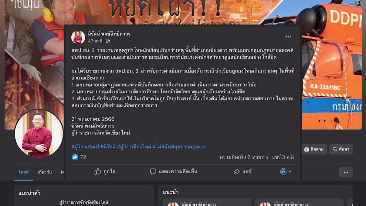 เด็กชายคนนี้อยู่ในเหตุการณ์วันที่ครูหนุ่มวัย 26 ปี ครูผู้ดูแลหอพักชายโรงเรียนแห่งหนึ่งในพื้นที่ ต.แม่นะ อ.เชียงดาว จ.เชียงใหม่ เตะต่อยนักเรียนชั้น ป.1 จำนวน 3 คน เมื่อวันที่ 17 มกราคม 2566 เพราะเด็กเข้าไปขโมยขนมในห้องพักครู จึงถูกทำโทษ แต่ไม่คิดว่าจะรุนแรงแบบนี้