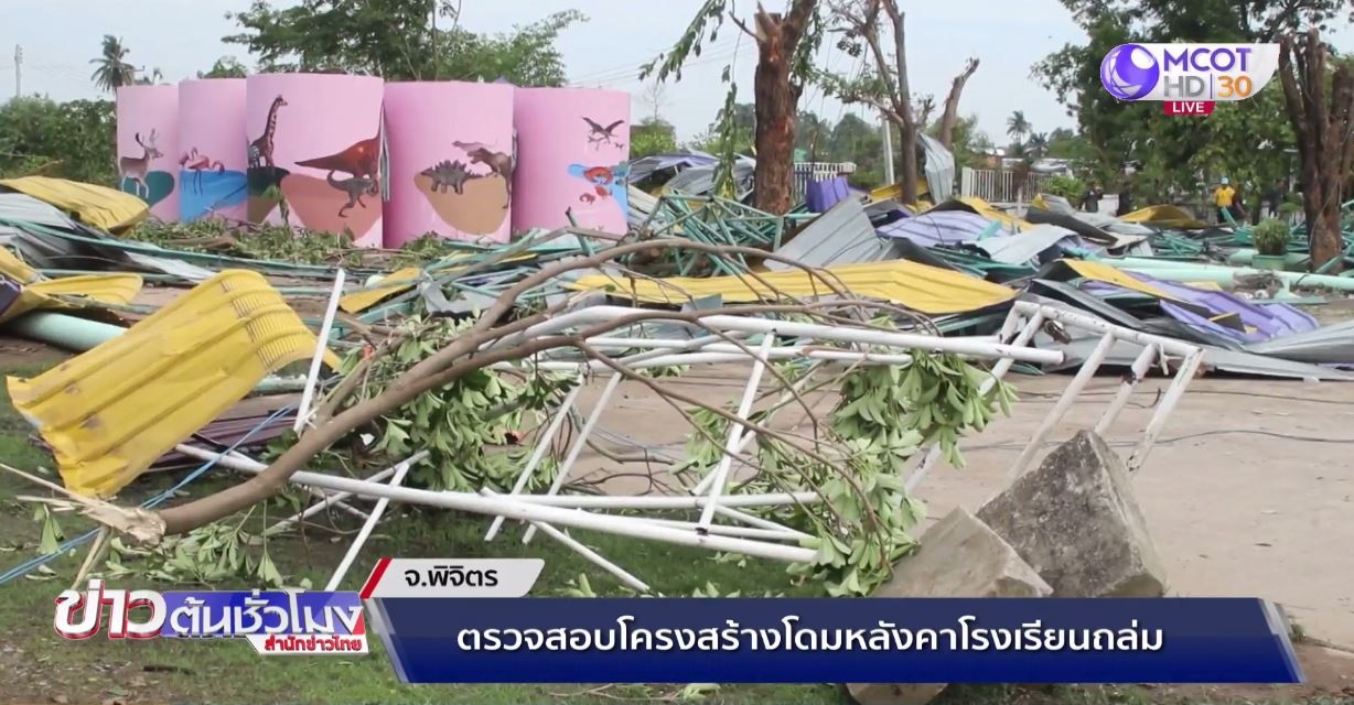 พิจิตร 23 พ.ค. – เจ้าหน้าที่เข้าตรวจสอบโครงสร้างหลังคาโดมโรงเรียนที่พังถล่ม ขณะที่ผู้ว่าฯ พิจิตร ประกาศเป็นพื้นที่ประสบภัยพิบัติ พร้อมสั่งการให้ตรวจสอบอาคารหน่วยงานต่างๆ ในจังหวัด ป้องกันเหตุซ้ำรอย